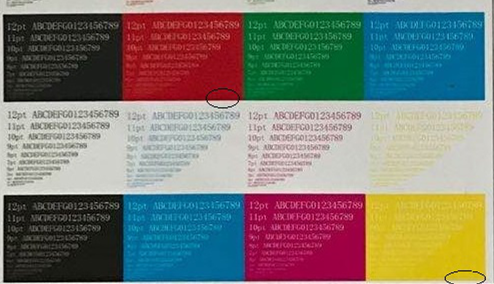測試說明:這次測試的小樣全為標(biāo)準(zhǔn)測試圖,我們截取了10米處打印樣品分別測試了畫質(zhì)、點(diǎn)形和點(diǎn)徑,色塊,大小,色彩,線條等品目。