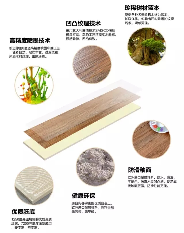 近年上市的仿古磚飛速發(fā)展,高恩仿古木紋磚的一些優(yōu)質(zhì)系列,如仿樹皮、仿原木之類的飾釉磚,表面是凹凸不平的立體面,其采用絲網(wǎng)印花和輥筒印花都無法實現(xiàn)的,既真實地還原自然材料的紋理和效果,還能在凹凸面上實現(xiàn)裝飾。