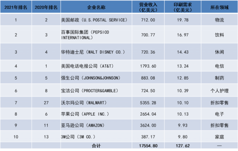 榜單顯示,2021年,美國百強(qiáng)印刷買家企業(yè)預(yù)計(jì)將采購562.11億美元的印刷品,同比2020年增長2.66%,占比達(dá)到美國印刷總需求1397.68億美元的28.7%。其中,前10強(qiáng)印刷買家企業(yè)的印刷總需求預(yù)計(jì)為127.62億美元,同比增長13%,在100家企業(yè)中占比達(dá)到22.7%,比重進(jìn)一步提升。