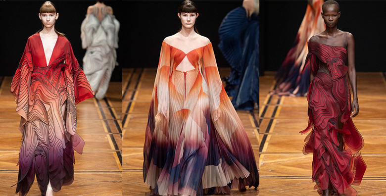 Iris van Herpen曾與面料創(chuàng)意藝術大師Viktor&Rolf一起工作,在設計風格上頗受其影響。她致力于探索如何利用3D打印制作時裝,幾乎每次高定秀都帶來獨特的視覺體驗。