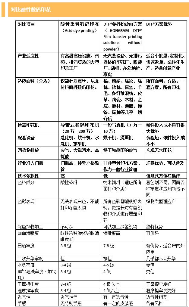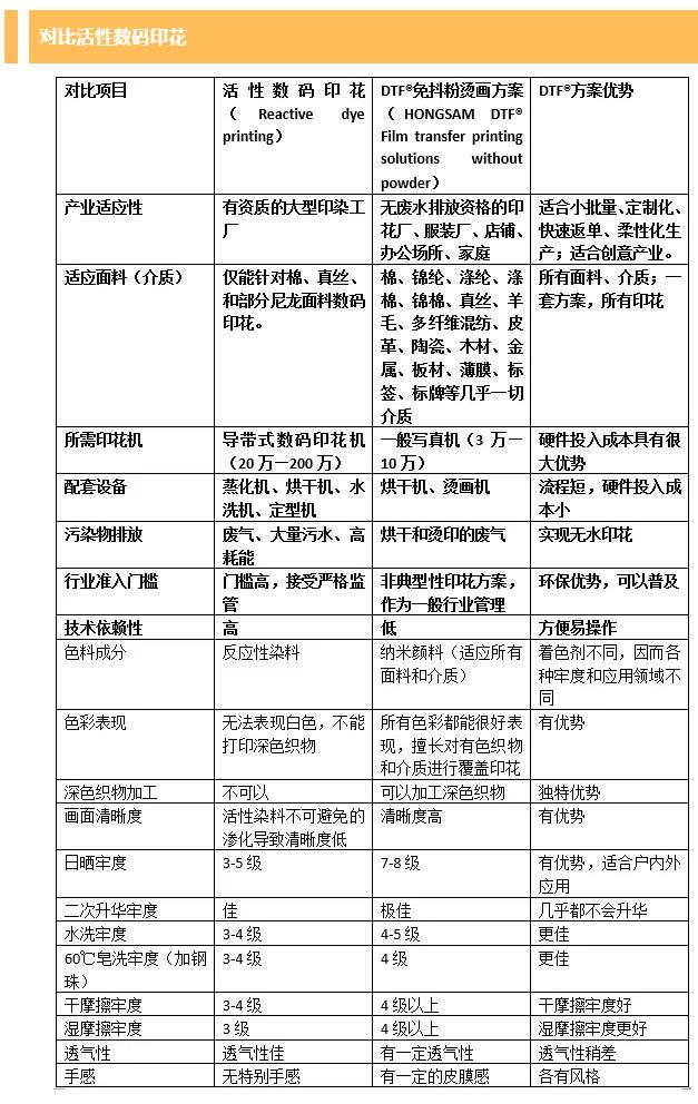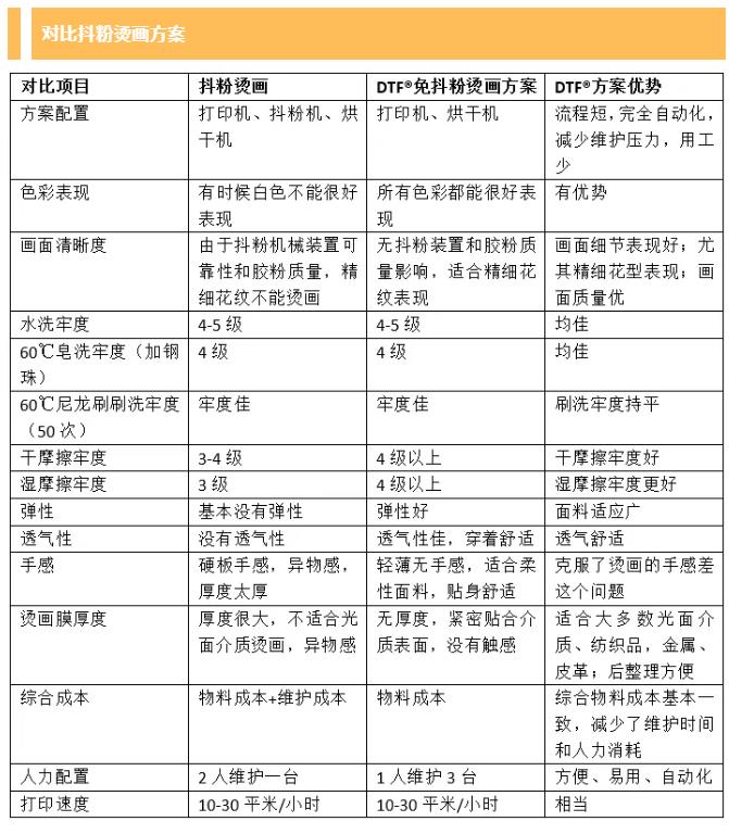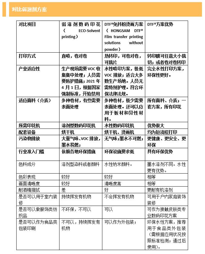 下面根據(jù)已有資料和行業(yè)認(rèn)知,將該方案和熱轉(zhuǎn)印、抖粉燙畫、涂料印花、弱溶劑等數(shù)碼印花方案做了對比。僅代表部分意見,雖然未必全面和科學(xué),希望窺斑見豹、拋磚引玉。