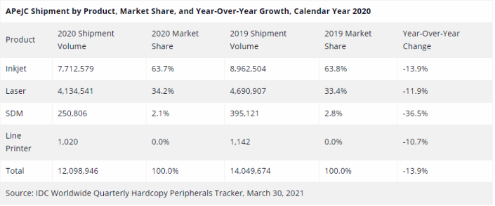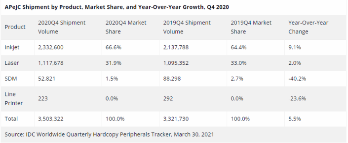 IDC近日發(fā)布了2020第四季度亞太地區(qū)(日本和中國(guó)除外)打印機(jī)出貨量為350萬(wàn)臺(tái),比去年同期的330萬(wàn)臺(tái)增長(zhǎng)5.5%,成為2020年首次錄得同比增長(zhǎng)的季度。而2020全年,該地區(qū)整體出貨量下降了13.9%。