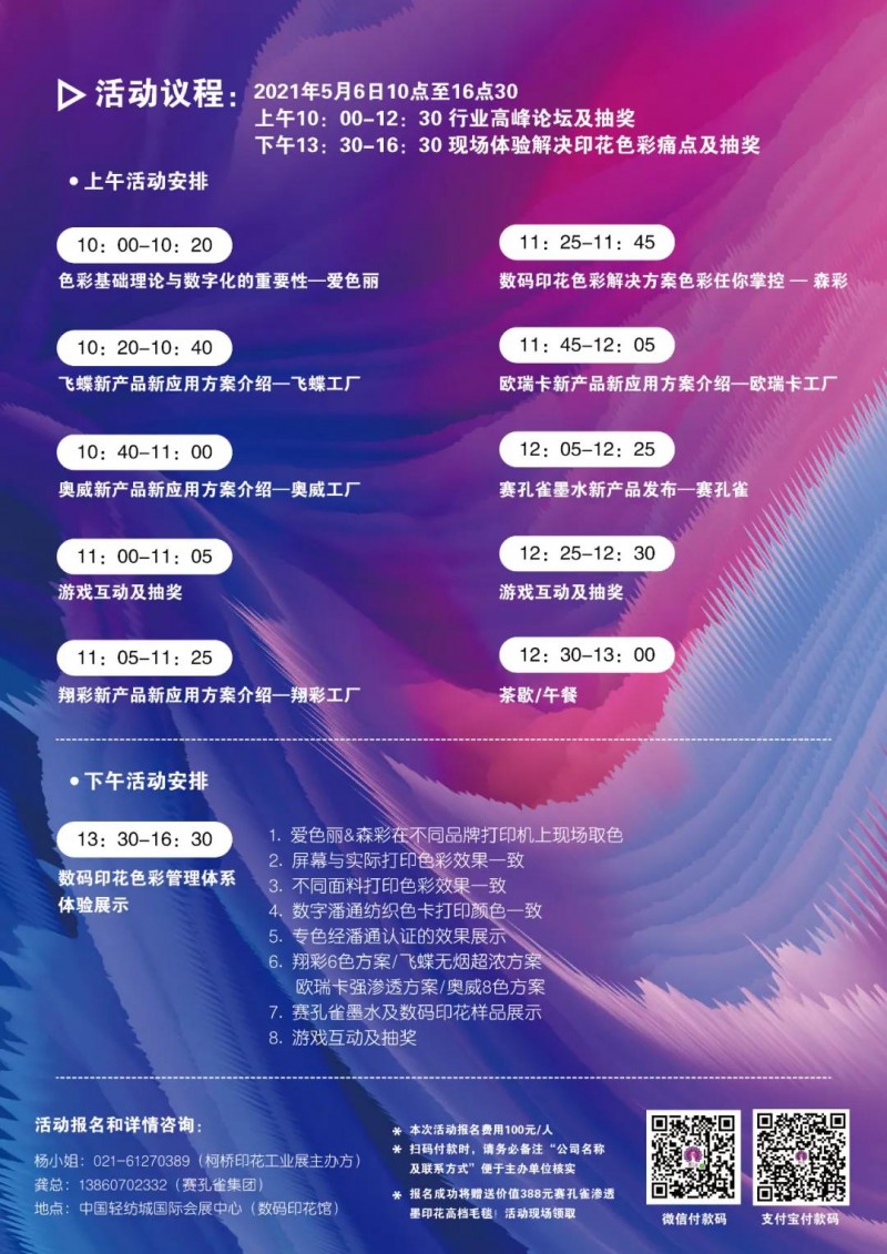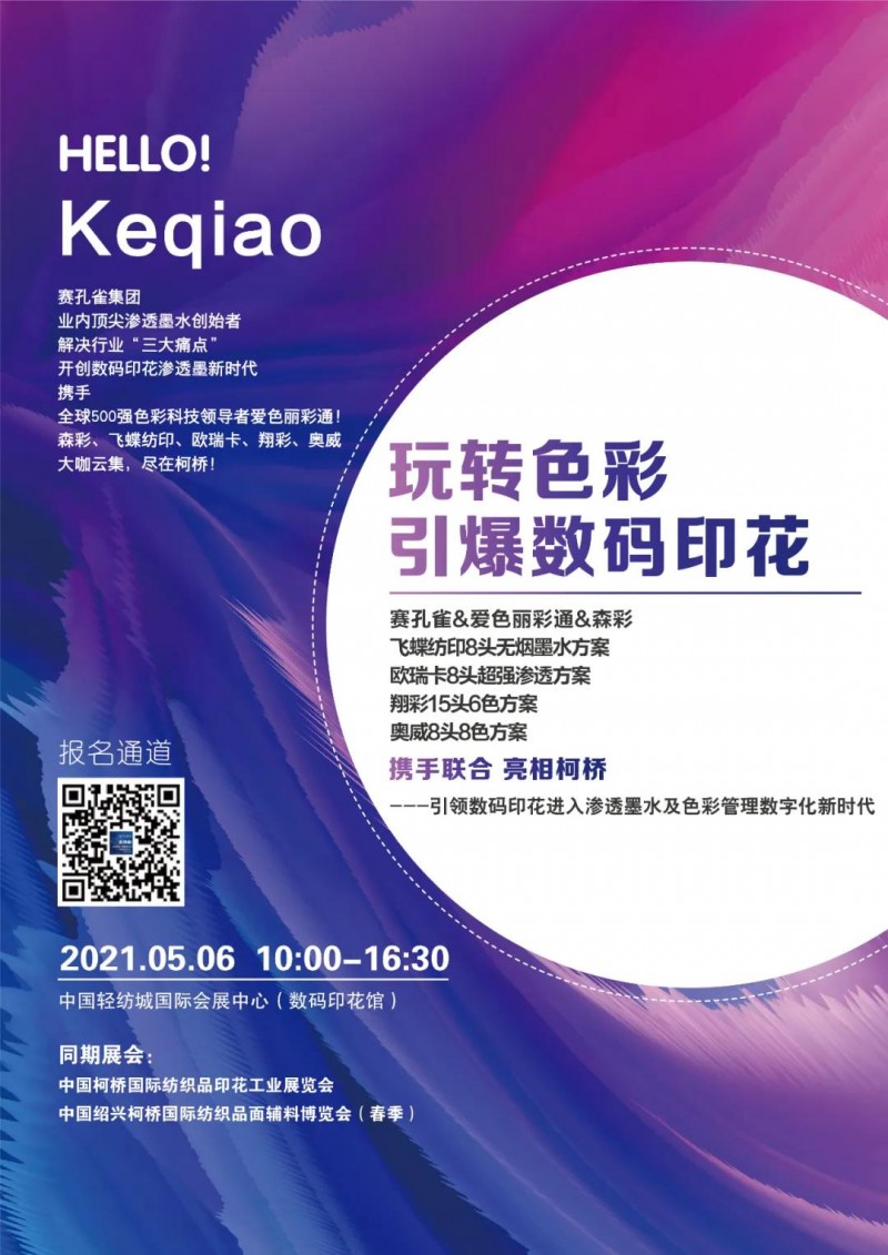 本次活動(dòng)由柯橋國(guó)際紡織品印花工業(yè)展組委會(huì)發(fā)起,與業(yè)內(nèi)頂尖滲透墨水創(chuàng)始者賽孔雀集團(tuán)聯(lián)手主辦,將集結(jié)全球500強(qiáng)色彩科技領(lǐng)導(dǎo)者愛色麗彩通,森彩,飛蝶紡印、歐瑞卡、翔彩、奧威,行業(yè)大咖們傾情加入!現(xiàn)場(chǎng)將您除了能聽到干活滿滿的行業(yè)高峰論壇,同時(shí)現(xiàn)場(chǎng)設(shè)置了體驗(yàn)專業(yè)區(qū),讓您體驗(yàn)解決印花色彩痛點(diǎn)的各種方案。最后更有豐富的抽獎(jiǎng)及互動(dòng)活動(dòng),期待您的蒞臨!我們不見不散!