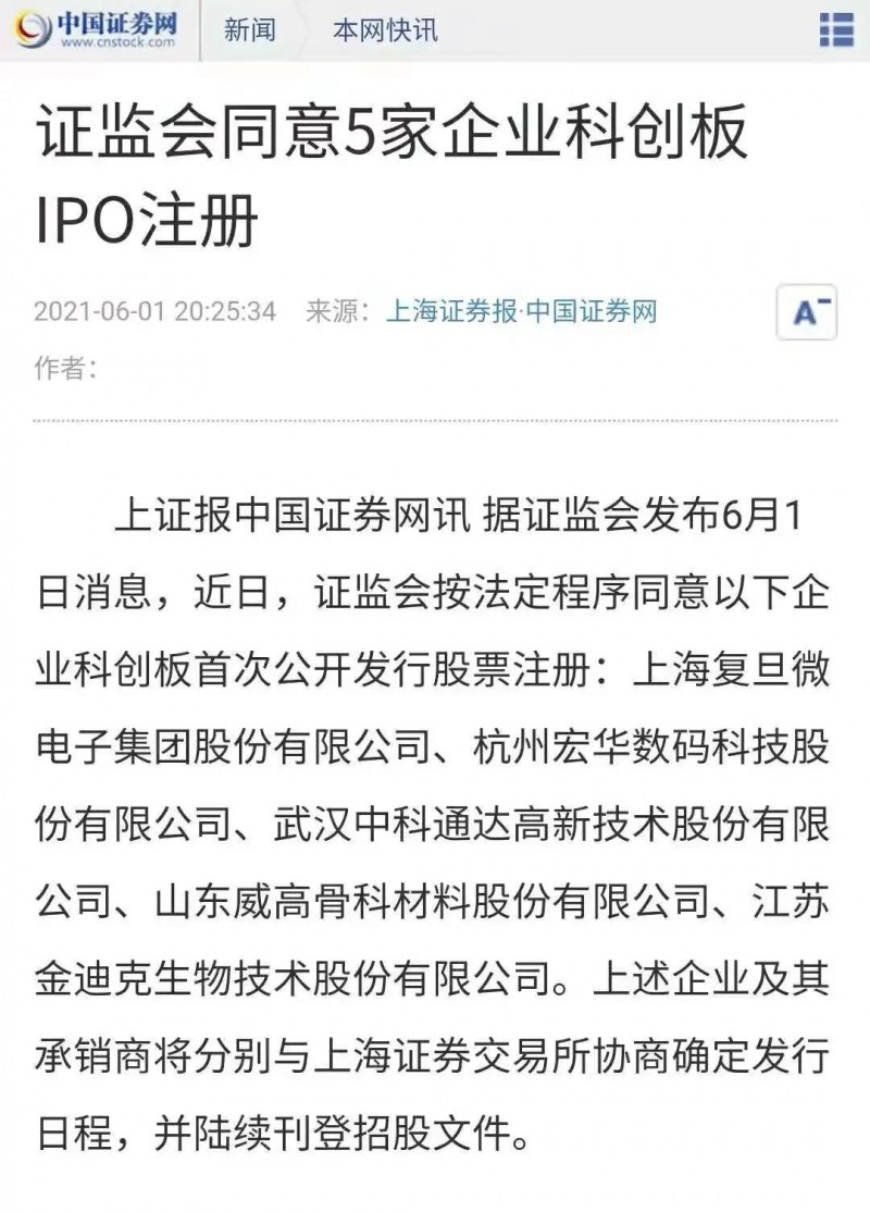 上證報中國證券網(wǎng)訊:據(jù)證監(jiān)會發(fā)布6月1日消息,近日,證監(jiān)會按法定程序同意以下企業(yè)科創(chuàng)板首次公開發(fā)行股票注冊:上海復(fù)旦微電子集團(tuán)股份有限公司、杭州宏華數(shù)碼科技股份有限公司、武漢中科通達(dá)高新技術(shù)股份有限公司、山東威高骨科材料股份有限公司、江蘇金迪克生物技術(shù)股份有限公司。上述企業(yè)及其承銷商將分別與上海證券交易所協(xié)商確定發(fā)行日程,并陸續(xù)刊登招股文件。