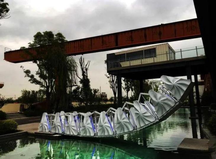 7月5日,中國(guó)首座運(yùn)用3D打印技術(shù)制造的可伸縮景觀人行橋亮相上海。該項(xiàng)目位于上海寶山區(qū)一號(hào)創(chuàng)新帶交運(yùn)智慧灣科創(chuàng)園,3D打印的景觀伸縮橋作為連接沿河步行道與高線廊道,是跨越園內(nèi)湖的必經(jīng)之路。