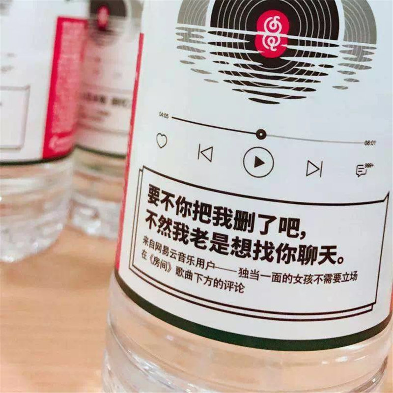 2017年,農(nóng)夫山泉與網(wǎng)易云音樂展開跨界合作,瓶身用網(wǎng)易云音樂的黑膠唱片拼成農(nóng)夫山泉的山水logo。