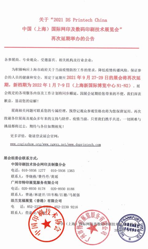 關(guān)于“2021 DS Printech China中國(上海)國際網(wǎng)印及數(shù)碼印刷技術(shù)展覽會(huì)”延期舉辦的公告