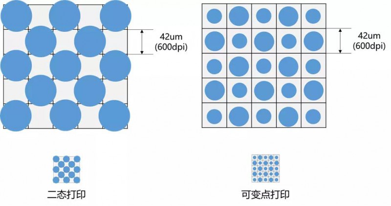 數(shù)碼打印在液滴量上也分為兩大類,二態(tài)打印和可變點(diǎn)打印。京瓷噴頭屬于后者,并且做到了高點(diǎn)火頻率下(30~40kHz)的4~5階的可變點(diǎn)打印。同打印濃度下,可變點(diǎn)的打印效果更為均勻,尤其是在打印純色塊,漸變細(xì)膩和細(xì)節(jié)豐富的圖案時(shí),可變點(diǎn)的優(yōu)勢(shì)尤為明顯。