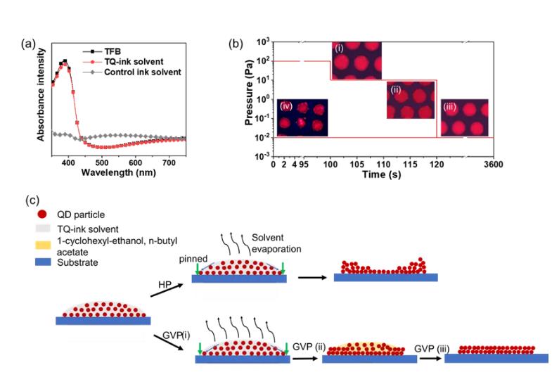 圖2.(a)TQ-ink墨水對下層友好,(b)不同真空方式對打印形貌的影響,(c)TQ-ink搭配GVP方式成膜機理圖