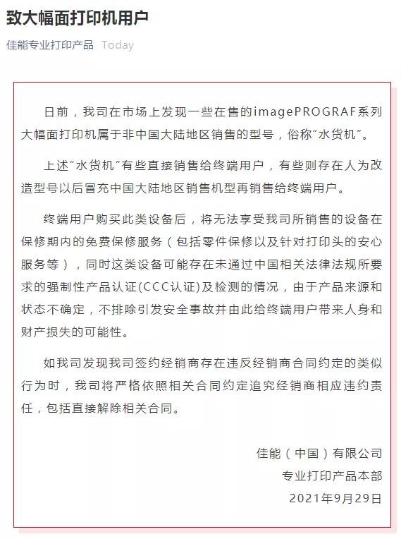 佳能今天就中國(guó)市場(chǎng)上出現(xiàn)的水貨佳能大幅面打印機(jī)和改型號(hào)佳能大幅面打印機(jī)發(fā)表聲明。
