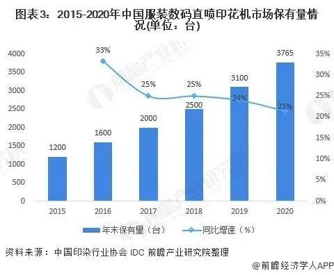 2015-2020年,中國服裝數(shù)碼直噴印花機的市場保有量逐年增長,由1200臺增長至3765臺,增速在20%以上。隨著我國服裝數(shù)碼噴墨印花技術的日益成熟以及市場需求的不斷增多,服裝數(shù)碼噴墨印花機數(shù)量呈穩(wěn)步上升的態(tài)勢。