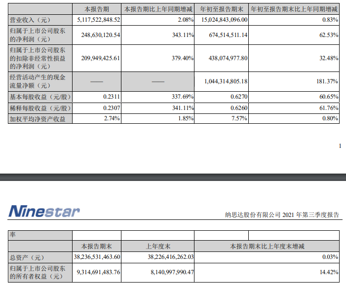 納思達(dá)發(fā)布公告稱,2021年前三季度,公司實(shí)現(xiàn)營業(yè)收入150.25億元,同比增長0.83%;歸屬于上市公司股東的凈利潤6.75億元,同比增長62.53%。其中,2021年第三季度,公司實(shí)現(xiàn)營業(yè)收入51.18億元,同比增長2.08%;歸屬于上市公司股東的凈利潤2.49億元,同比增長343.11%。
