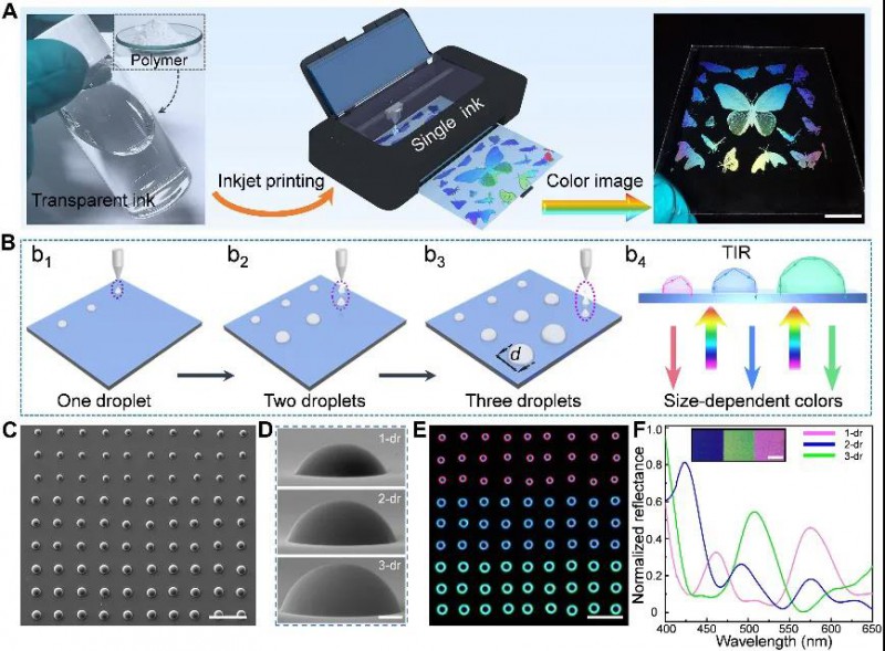 近日,中國科學(xué)院化學(xué)研究所的李明珠研究員和宋延林研究員等人在Science Advances 雜志上發(fā)表論文,進(jìn)一步拓展了全內(nèi)反射和干涉機(jī)制,開發(fā)出一種簡單易行的使用無色墨水的全彩色噴墨打印策略。通過控制普通聚合物材料制成的墨水和基板的潤濕性,就可以打印出整個(gè)可見光區(qū)域內(nèi)的顏色,且色彩飽和度、亮度等都可以精確調(diào)控。這為低成本、高產(chǎn)量的結(jié)構(gòu)全彩色打印開辟了一條可行的道路。