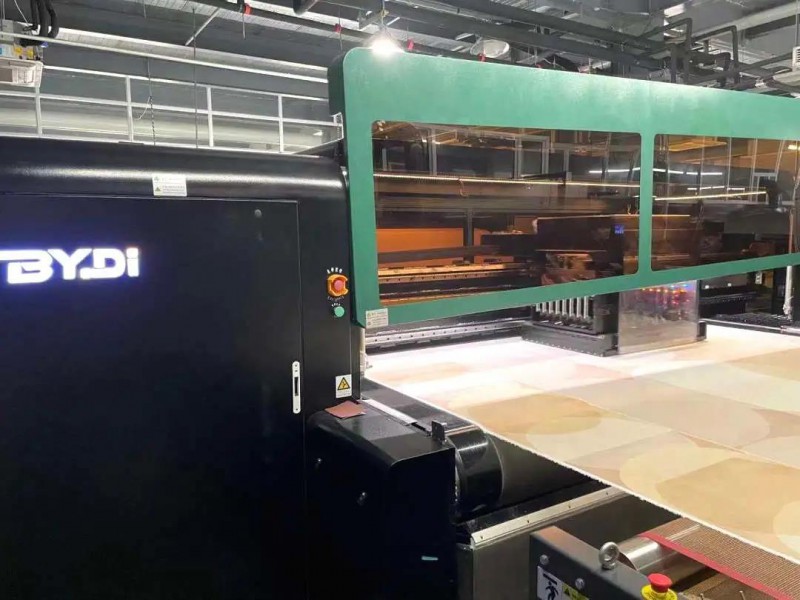 印花廠房?jī)?nèi),一臺(tái)32頭的博達(dá)涂料數(shù)碼高速打印機(jī)正在進(jìn)行訂單生產(chǎn),這也是國(guó)內(nèi)落地的第一臺(tái)32頭博達(dá)(博印)涂料數(shù)碼打印設(shè)備。工作人員告訴我們,這臺(tái)涂料數(shù)碼印花機(jī)今年七月份才剛剛新上,與一臺(tái)8頭涂料打樣設(shè)備相互配合,足以實(shí)現(xiàn)高效的快返訂單生產(chǎn)。目前正在打印的就是用于制作嬰幼兒產(chǎn)品的紗布訂單,打印完成后就將發(fā)向澳大利亞。