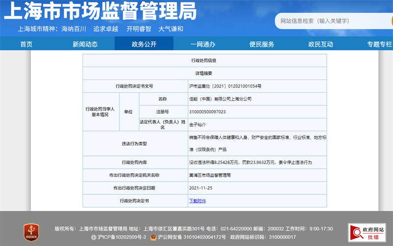 據(jù)上海市市場監(jiān)督管理局網(wǎng)站消息,近日,佳能(中國)有限公司上海分公司因銷售不合格多功能打印一體機,違反了《中華人民共和國產(chǎn)品質(zhì)量法》相關(guān)規(guī)定,構(gòu)成銷售不符合保障人體健康和人身、財產(chǎn)安全的標準和要求的工業(yè)產(chǎn)品的行為,被上海市黃浦區(qū)市場監(jiān)督管理局罰款23.9632萬元,沒收違法所得8.25428萬元。