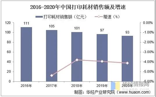 據(jù)統(tǒng)計(jì),2020年中國(guó)打印耗材銷(xiāo)售額為93億元,同比下降4.1%,2016-2020年我國(guó)打印耗材銷(xiāo)售額逐年下降,2016-2020年CAGR為-4.3%。