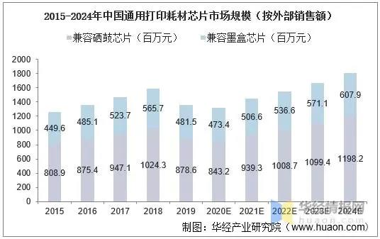 2015年至2019年,中國(guó)通用打印耗材芯片市場(chǎng)規(guī)模(按外部銷(xiāo)售金額)從12.6億元增長(zhǎng)至13.6億元,2015-2019年CAGR為2.0%,2019年通用硒鼓芯片和通用墨盒芯片的銷(xiāo)售額占比分別為64.6%和35.4%。
