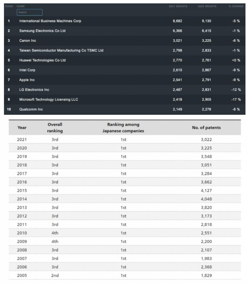 近日,專利數(shù)據(jù)庫提供商IFI Claims Patent Services發(fā)布的最新研究報告顯示,老牌打印廠商佳能2021年獲得了3021件美國專利(佳能官方公告3022件),排名第三。由此將連續(xù)專利數(shù)排名前5的歷史延長到了36年,且是全球唯一。同時佳能是日本公司在美獲取專利數(shù)連續(xù)17年排名第一。