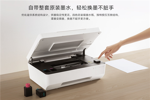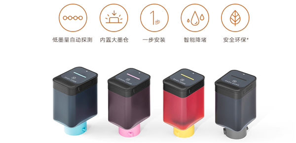 新品采用優(yōu)質(zhì)原裝四色燃料墨水,色彩更真實(shí),墨水瓶采用隱性警示燈設(shè)計(jì),低墨量下自動(dòng)提示。