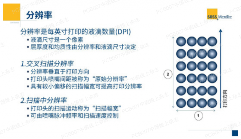 下文將說明和討論每個(gè)特性。每英寸點(diǎn)數(shù)(dot per inch,簡(jiǎn)稱DPI)單位的簡(jiǎn)短說明,這是常用的打印分辨率單位。作為二維目標(biāo)圖像需要兩種分辨率。兩個(gè)維度通常具有相同的分辨率,因此實(shí)際只存在一個(gè)維度。噴墨打印以不同的方式識(shí)別和實(shí)現(xiàn)兩種分辨率(即使數(shù)值相等時(shí)):交叉掃描分辨率是NPI和小步移動(dòng)的組合。它的正交等效物——掃描分辨率,形成了速度和噴射頻率之間的關(guān)系。圖1為分辨率的解釋。
