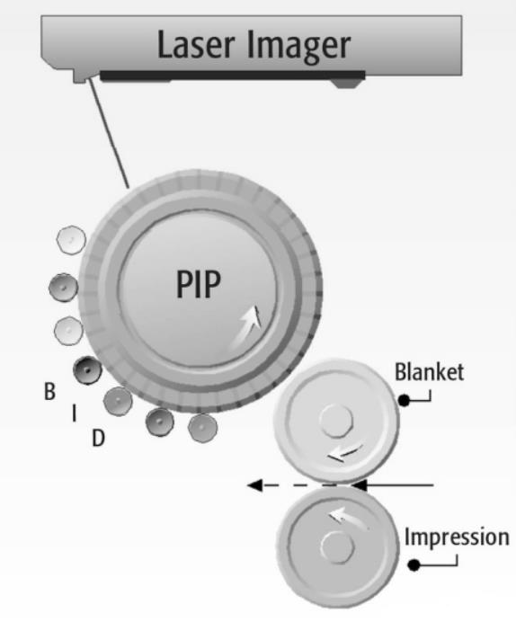 因?yàn)閕ndigo獨(dú)特的液體電子油墨的特性, 在轉(zhuǎn)印過(guò)程中版印滾筒每印刷一個(gè)顏色旋轉(zhuǎn)一周而且橡皮布上不會(huì)留下油墨印跡, 這可以允許Indigo印刷機(jī)只有一組滾筒就可以印刷所有色序。