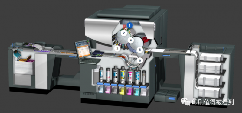 使用電子油墨的惠普Indigo數(shù)字印刷機(jī)本質(zhì)上是一款特殊的激光成像數(shù)字印刷機(jī), 因?yàn)橛幸坏老鹌げ嫁D(zhuǎn)印的過(guò)程, 也被稱為數(shù)字版彩色膠印機(jī)。