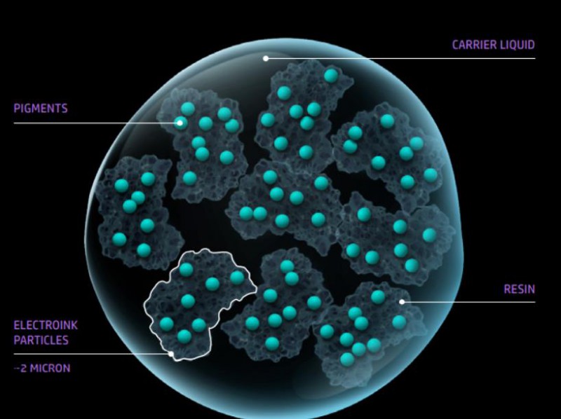 Indigo印刷機(jī)這種獨(dú)一無(wú)二的液體電子油墨包含很小的可以充電的顏料(Pigments)墨滴(ElectroInk Particles), 可以在任何承印物上產(chǎn)生非常薄的墨層。其直徑1-2μm, 包含在絕緣的攜帶液(Carrier Liquid)中, 可以保證圖像的高解析度和高清晰度。電子油墨的固化依賴于油墨中的新型樹脂材料(Resin), 在與紙或其他承印物接觸時(shí)可以立即固化, 印出的圖像更銳利, 網(wǎng)點(diǎn)沒(méi)有虛化的邊緣及擴(kuò)散。
