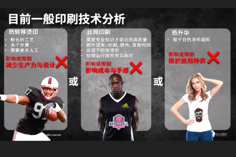 在全新的時尚發(fā)展趨勢下,市場對印花技術(shù)提出了個性化、按需生產(chǎn)以及可持續(xù)時尚的全新要求。而目前普遍應(yīng)用于服裝印花的熱轉(zhuǎn)移燙印、絲網(wǎng)印刷及熱升華等工藝普遍在滌綸面料上存在著顏色深度和清晰度不夠、容易滲色、印花部分手感硬等各式各樣的技術(shù)挑戰(zhàn)。
