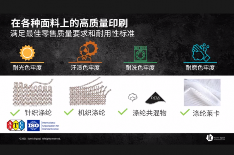 接下來,會議直播連線康麗數(shù)碼位于香港的演示中心現(xiàn)場為大家?guī)砹薑ornit Avalanche Poly Pro的打印演示及應(yīng)用分享。通過整體解決方案的展示,Kornit Avalanche Poly Pro以其無設(shè)計限制,防止染料泳移、滿足各種面料上的高質(zhì)量印刷、達到運動與行業(yè)的最高要求以及可持續(xù)的印花工藝獲得了市場的廣泛認可。據(jù)了解,目前在運動服集聚的泉州地區(qū),已有康麗的企業(yè)用戶正在應(yīng)用這套方案。