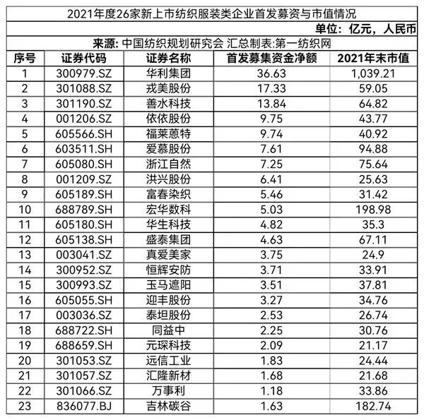 中國紡織規(guī)劃研究會認為,2021年度紡織服裝類新上市企業(yè)的特點是上市企業(yè)家數(shù)多,但每家上市融資金額都不是很大。這與紡織服裝行業(yè)以中小企業(yè)居多,近些年來絕大多數(shù)上市的優(yōu)秀紡織服裝類企業(yè)都是高新技術(shù)型或技術(shù)創(chuàng)新型中小企業(yè),這類企業(yè)多選擇在中小、創(chuàng)業(yè)板塊上市有關(guān)。