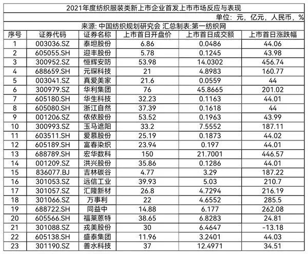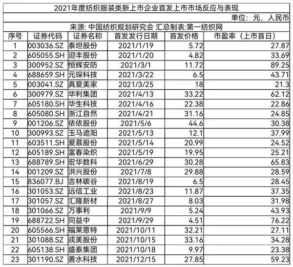 中國紡織規(guī)劃研究會強調(diào),2021年度紡織服裝類新上市23家企業(yè)在首發(fā)上市日的市場反應(yīng)和整體表現(xiàn)是非常不錯的。從相關(guān)資料統(tǒng)計情況看,上市首日市場平均估值(市盈率)39.13,中位數(shù)31.98。從二級市場直接反映出來的估值看,科技含量高應(yīng)用廣泛或附加價值高的產(chǎn)業(yè)用紡織品類企業(yè)普遍被市場追捧;上市首日開盤股價相比發(fā)行價漲幅表現(xiàn)優(yōu)異,(增幅)平均值達82.07%;上市首日成交總額144.90億元;上市首日平均漲幅126.78%,有9家首日漲幅超過100%,恒輝安防、宏華數(shù)科和萬事利分別以456.74%、446.57%和285.50%的漲幅位列前三。(中國紡織規(guī)劃研究會)