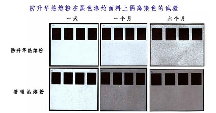 解決的方法是使用防升華熱熔粉和選擇色牢度好的面料,以下是一組防升華熱熔粉效果的試驗: