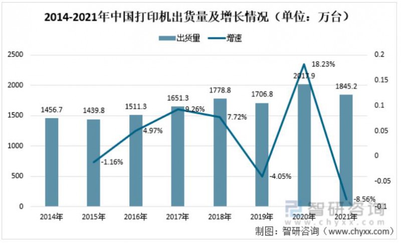 近日,中國產(chǎn)業(yè)咨詢領(lǐng)域的信息與情報綜合提供商智研咨詢發(fā)布了《2022-2028年中國打印機行業(yè)市場現(xiàn)狀分析及未來前景分析報告》。報告稱,2020年疫情期間,家庭打印需求呈現(xiàn)出了井噴式爆發(fā),學(xué)生在線學(xué)習(xí)和員工在家遠程辦公帶來大量作業(yè)及文件打印需求,成為了市場增長的主要驅(qū)動力。進入2021年,疫情得到有效控制,生產(chǎn)生活逐步常態(tài)化,消費市場需求出現(xiàn)回落。2021年全年,中國打印外設(shè)市場出貨量為1845.2萬臺,同比下降8.56%。