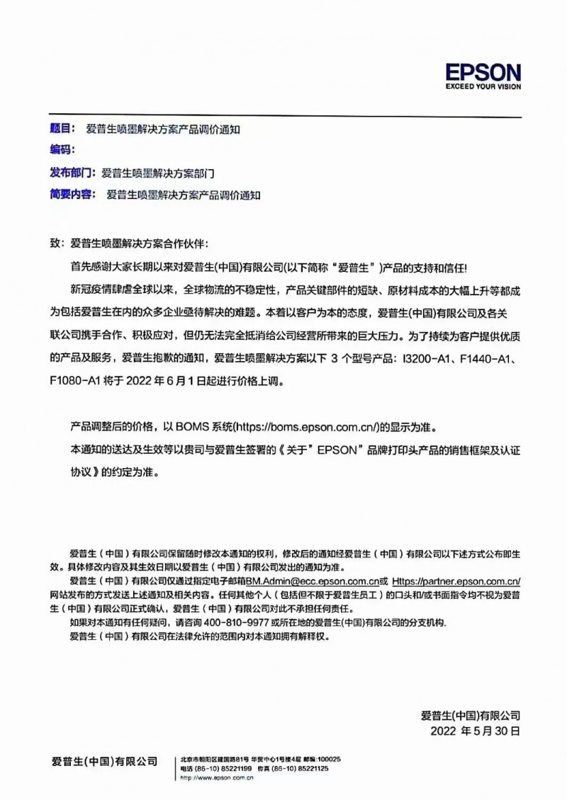 近兩天,這樣的消息在朋友圈刷屏。根據(jù)愛普生發(fā)布的噴墨解決方案產(chǎn)品調(diào)價通知,愛普生受到全球物流與原材料成本上漲等影響,決定從2022年6月1日起對13200-A1、F1440-A1、F1080-A1三個型號產(chǎn)品進行價格上調(diào)。