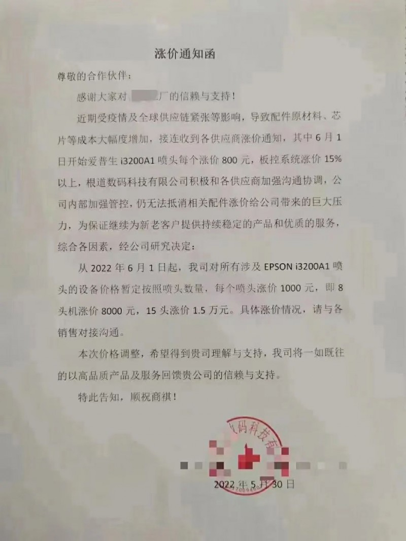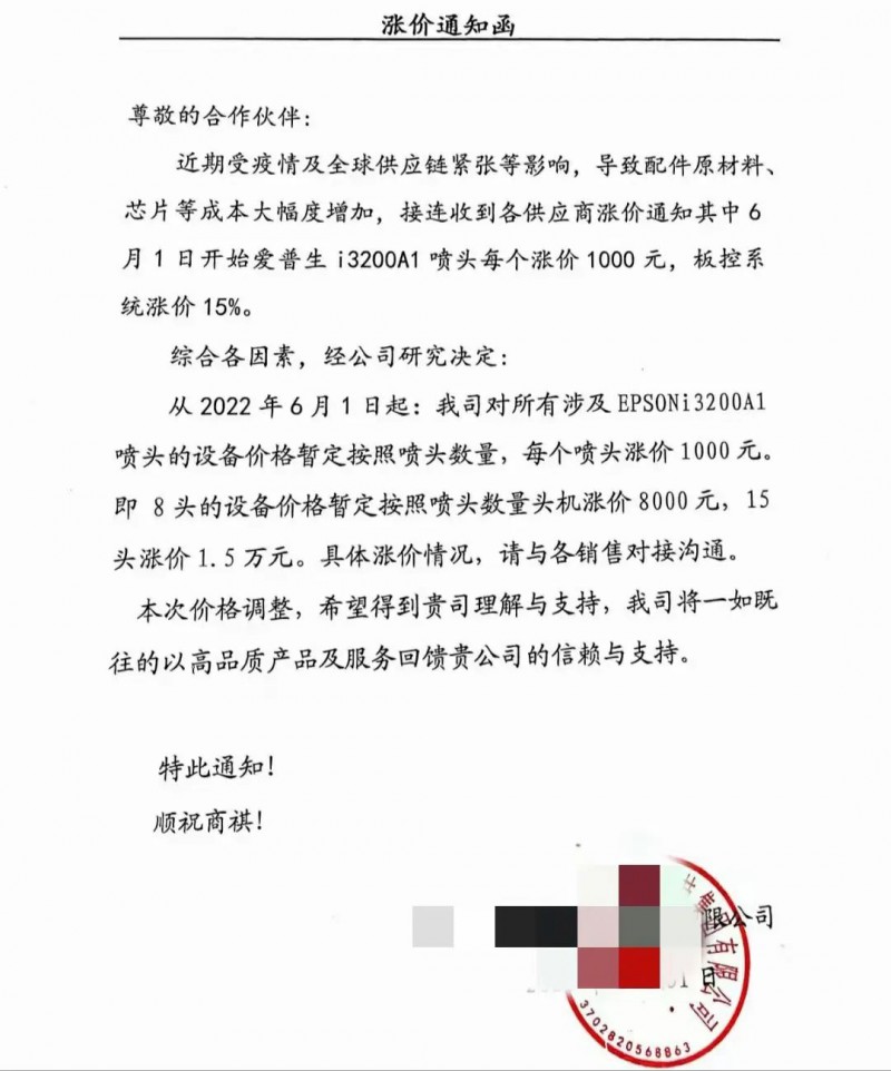 牽一發(fā)而動全身,隨著打印頭與板卡的成本上漲,已有多家數(shù)碼印花設(shè)備企業(yè)發(fā)布調(diào)價公告。根據(jù)部分設(shè)備品牌的消息,6月1日起,凡涉及EPSON i3200A1打印頭的數(shù)碼設(shè)備暫定按照每個打印頭漲價1000元的幅度進行價格上調(diào),8頭機漲價8000元,15頭機漲價15000元!