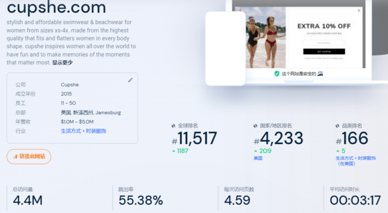 美國(guó)作為主要的出海市場(chǎng),孵化誕生或是培育了眾多DTC泳裝品牌,來(lái)自中國(guó)的Cupshe就是一個(gè)典型的成功案例。目前,Cupshe在Facebook的粉絲已經(jīng)超過(guò)107萬(wàn),更為矚目的是,其DTC主網(wǎng)站的月瀏覽量達(dá)到百萬(wàn)級(jí)別(4月超過(guò)440萬(wàn))