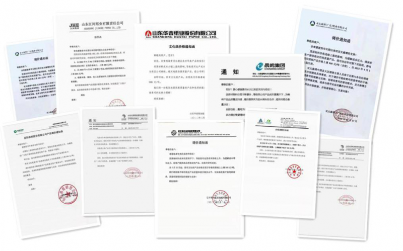 山東晨鳴紙業(yè)銷售有限公司:因頂材物料價格持續(xù)高位,導(dǎo)致我公司運營成本居高不下,為確保產(chǎn)品質(zhì)量,維護貴我雙方的長期友好合作,經(jīng)研究決定,函告貴司如下:自8月1日起,晨鳴文化紙系列產(chǎn)品價格上調(diào)200元/噸。