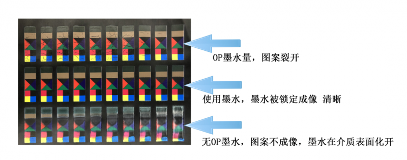 乳膠墨水分為OP(optimizer)墨水與彩色墨水,OP墨水與彩色墨水由噴頭噴射后在介質(zhì)表面迅速反應(yīng)、結(jié)合成像,后經(jīng)合適的溫度烘干,完成打印流程。OP墨水在打印過程中具有鎖定彩色墨滴與產(chǎn)生牢度的作用。