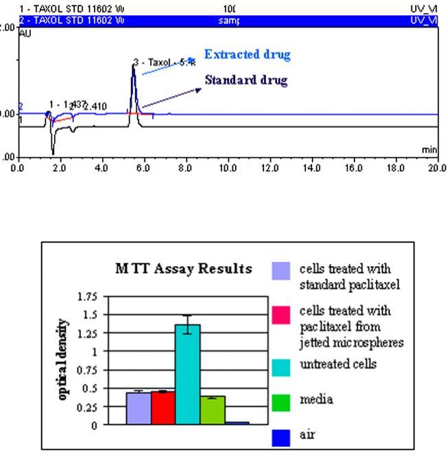 ▲ 圖2 標準的紫杉醇與從制備的微球中提取的紫杉醇的比較。上圖:HPLC色譜圖比較。下圖:組織培養(yǎng)比較。