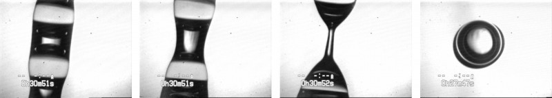 ▲ 圖4. 空心球形成過程中示意圖。在壓電元件產(chǎn)生的外部擾動下,兩個同心流體的流注分解成多個球體。