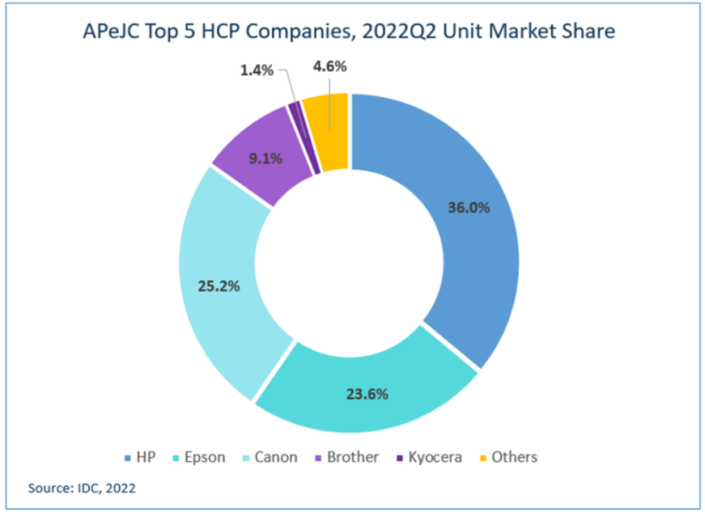 愛普生市場份額為23.6%,為第三位。愛普生是在印度尼西亞、菲律賓和臺灣地區(qū)表現(xiàn)最好的品牌。與佳能和惠普相比,愛普生在該地區(qū)許多國家受到了供應鏈和生產(chǎn)的嚴重影響。愛普生本季度的出貨量是2021年以來的最低值,錄得16.5%的同比下降和22.5%的環(huán)比下降。