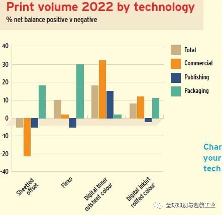 投資計劃反映在印刷技術(shù)對印刷量的預(yù)期變化中。據(jù)報道,商業(yè)和出版印刷商的單張紙膠印印刷量下降,尤其是彩色碳粉印刷量的增長,而出版印刷商更加謹慎??赡苁沁@種情況出版印刷商也更關(guān)注單色印刷(未在圖表中列出)。有趣的是,包裝印刷商的所有流程都顯示出產(chǎn)量增長,尤其是柔印。