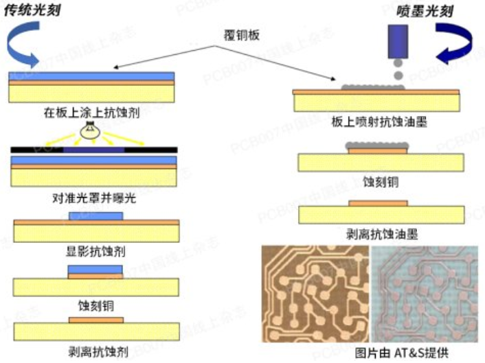 作為打印阻焊油墨和圖形油墨的一種方法,噴墨打印的優(yōu)勢(shì)已得到業(yè)界公認(rèn)。噴墨打印內(nèi)層蝕刻的抗蝕劑,具有線寬、線距可達(dá)到小于70μm的優(yōu)勢(shì)。越來越多的應(yīng)用是用于導(dǎo)電走線的增材打印。銀納米粒子現(xiàn)在盛行,銅納米粒子油墨正在增長(zhǎng),碳納米管很快就會(huì)出現(xiàn)。