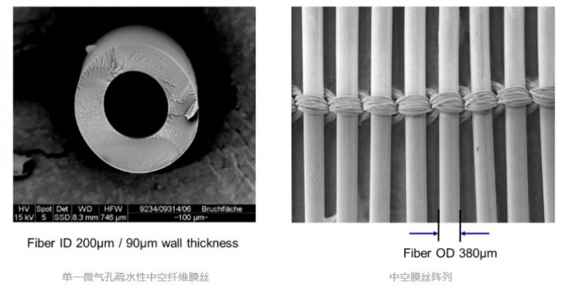 膜絲采用編織工藝均勻排布,可以保證產(chǎn)品一致性,更重要的是使得流體能均勻接觸每根膜絲防止旁漏。編織排布還可以保證更高的封裝率,使得體積更緊湊。