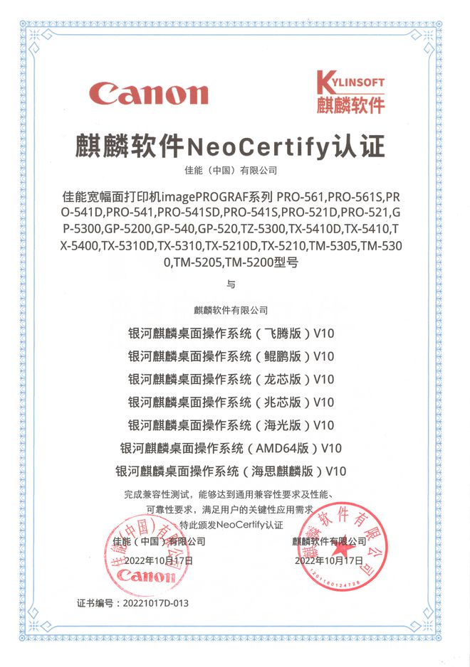 不僅僅是統(tǒng)信 UOS,佳能大幅面噴墨打印機(jī)之前也完成國產(chǎn)銀河麒麟平臺的系列認(rèn)證。
