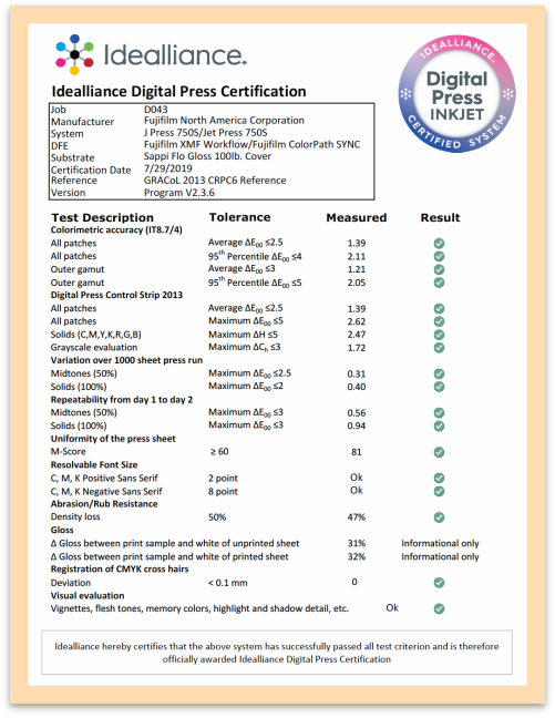 作為同時(shí)獲得Idealliance噴墨數(shù)碼印刷系統(tǒng)認(rèn)證和ISO/PAS 15339數(shù)碼印刷系統(tǒng)認(rèn)證的機(jī)型,750S在北美地區(qū)的表現(xiàn)也是出類拔萃。數(shù)碼印刷認(rèn)證項(xiàng)目自2011發(fā)布以來已有10年歷史,以國際標(biāo)準(zhǔn)ISO 12647-8,ISO 15311和ISO 15339為基礎(chǔ)框架,而開發(fā)完善的印刷體系認(rèn)證。該項(xiàng)目認(rèn)證商業(yè)生產(chǎn)型噴墨、高速、單張和輪轉(zhuǎn)刷數(shù)碼印刷機(jī)的能力,檢驗(yàn)它們是否能滿足特定的印刷標(biāo)準(zhǔn)。該項(xiàng)目包括測試和認(rèn)證顏色、印刷特性、和印刷生產(chǎn)等方面,它考慮了整個(gè)印刷系統(tǒng),包括數(shù)字前端,打印引擎和承印紙張等。