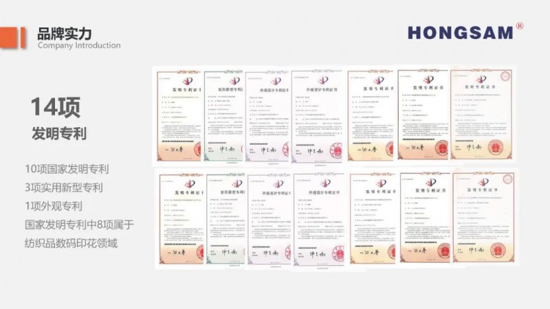 鴻盛數(shù)碼通過持續(xù)技術(shù)研發(fā)及工藝創(chuàng)新,降低了客戶對(duì)進(jìn)口墨水的依賴度及采購成本,促進(jìn)行業(yè)向節(jié)能環(huán)保、清潔生產(chǎn)方向轉(zhuǎn)型。企業(yè)針對(duì)不同系列產(chǎn)品,建立專項(xiàng)研發(fā)項(xiàng)目組,保證每款產(chǎn)品的持續(xù)跟進(jìn)優(yōu)化。截止目前,鴻盛數(shù)碼擁有14項(xiàng)專利,其中10項(xiàng)國家發(fā)明專利,其中8項(xiàng)為數(shù)碼印花類的專利,囊括鴻盛數(shù)碼紡織五朵金花“絲美特®”酸性染料墨水、“鴻美®”高溫分散墨水,“捷特絲®”紡織涂料墨水、“銳美®”活性染料墨水、鴻盛陽離子染料墨水。