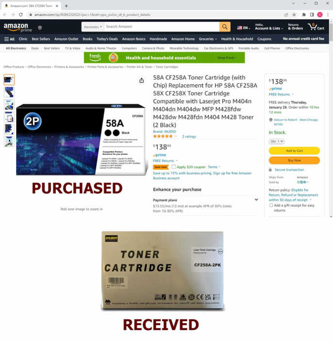 指控表示,被告亞馬遜等電子商務(wù)平臺(tái)的廣告中公然抄襲惠普已建立的和公認(rèn)的惠普原裝墨水和碳粉包裝的商業(yè)外觀,是一種故意的欺騙行為。