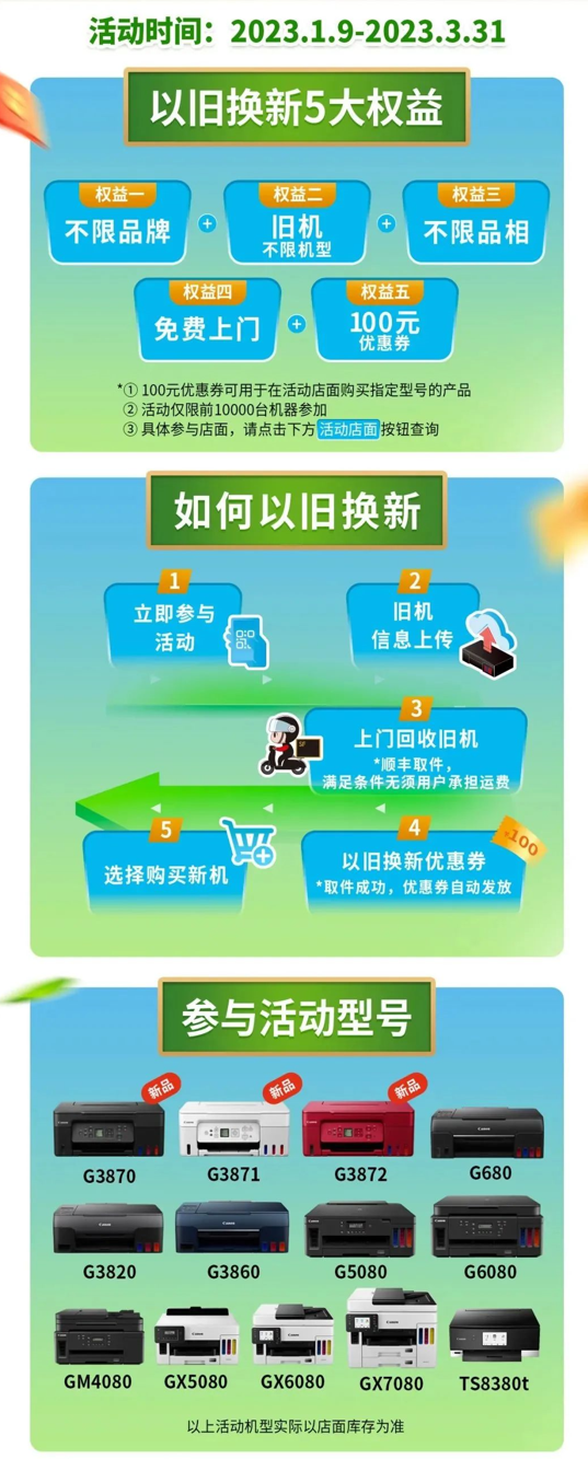 近日,佳能針對家用打印機開展以舊換新限時活動,舊機不限品牌與機型,線下實體門店和微信商城都可參與?;顒訒r間為1月9日至3月31日。