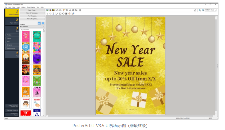 針對于餐廳、酒店、零售店等使用場景,imagePROGRAF TC-5200還支持Poster Artist Lite軟件應用方案,用戶可以輕松制作海報和傳單。Poster Artist Lite提供種類繁多的模板,讓用戶可以根據自己的需要選擇素材,隨心編輯文字和圖片,即使非專業(yè)人士也能輕松進行設計創(chuàng)作。在即將發(fā)布的V3.5版本中,還增加了擁有金色/銀色紋理效果的模板,更加契合中國市場用戶的使用習慣。